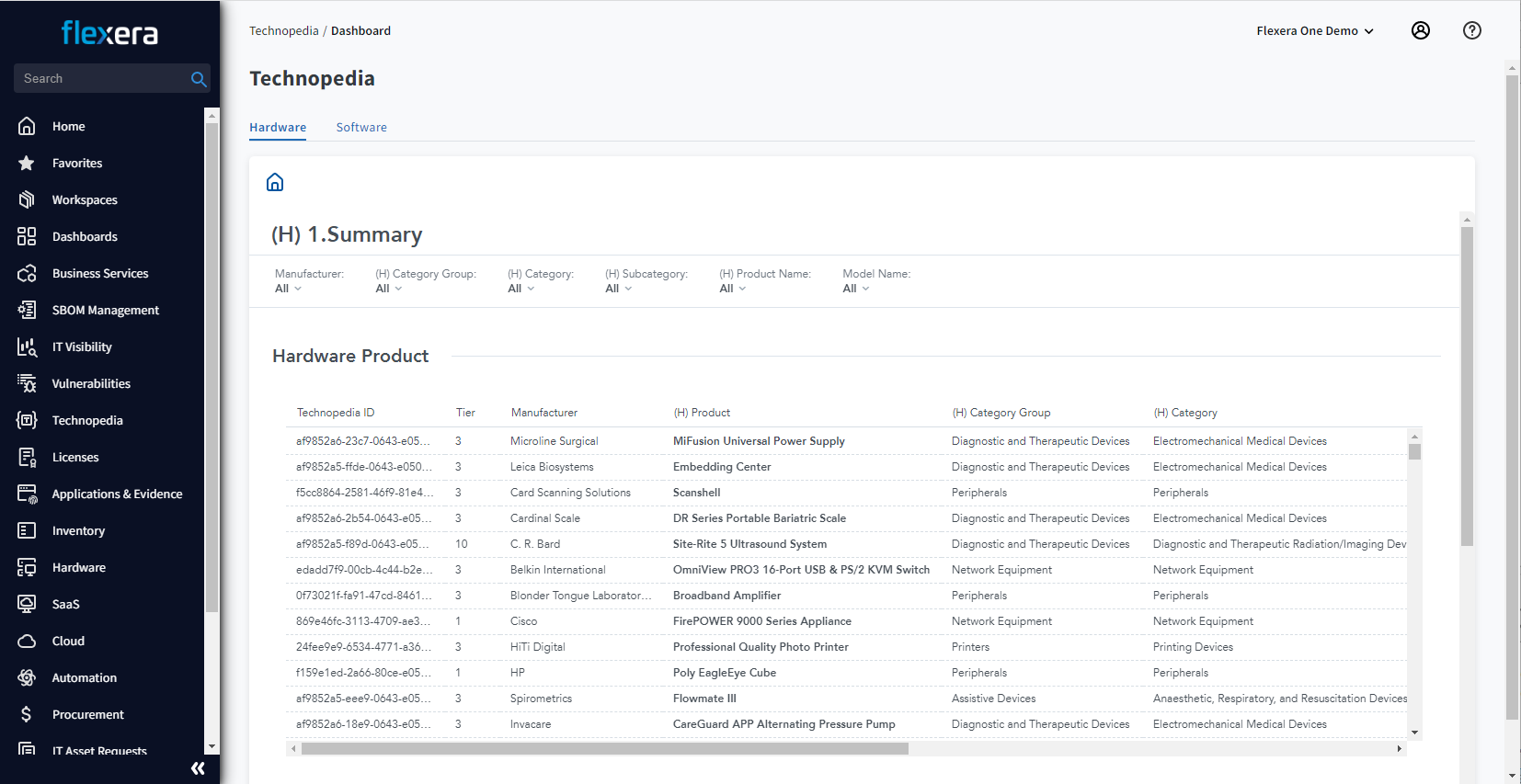 A new Technopedia menu item, available to Flexera One customers with entitlements to IT Visibility or standalone Technopedia, provides Hardware and Software dashboards.