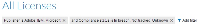 Your manager says, “How many licenses do we have for our big three publishers where we are not compliant?” Because the simple filter does not have settings for “Is not”, you choose all the other values except Compliant for your filter.