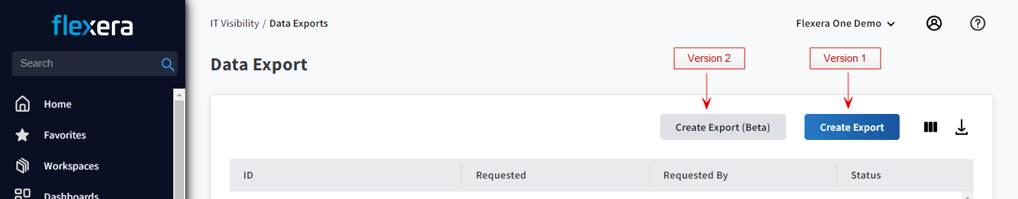 To check whether you are using Technology Intelligence Platform version of export versus a Pre-Technology Intelligence Platform version (export version 1, version 2, or version 3), go to the Data Export page (IT Visibility > Data Exports) and verify the following: