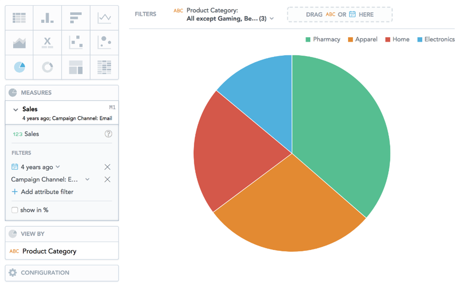 Pie charts have the following sections: Measures, View by, and Configuration.