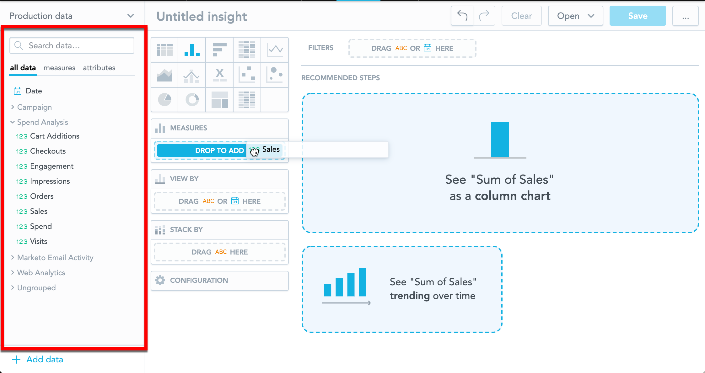 To add items from the Data Catalog to your insight, drag and drop them into the appropriate section in the insight. For details about creating insights, see Creating Insights to Visualize Your Data.